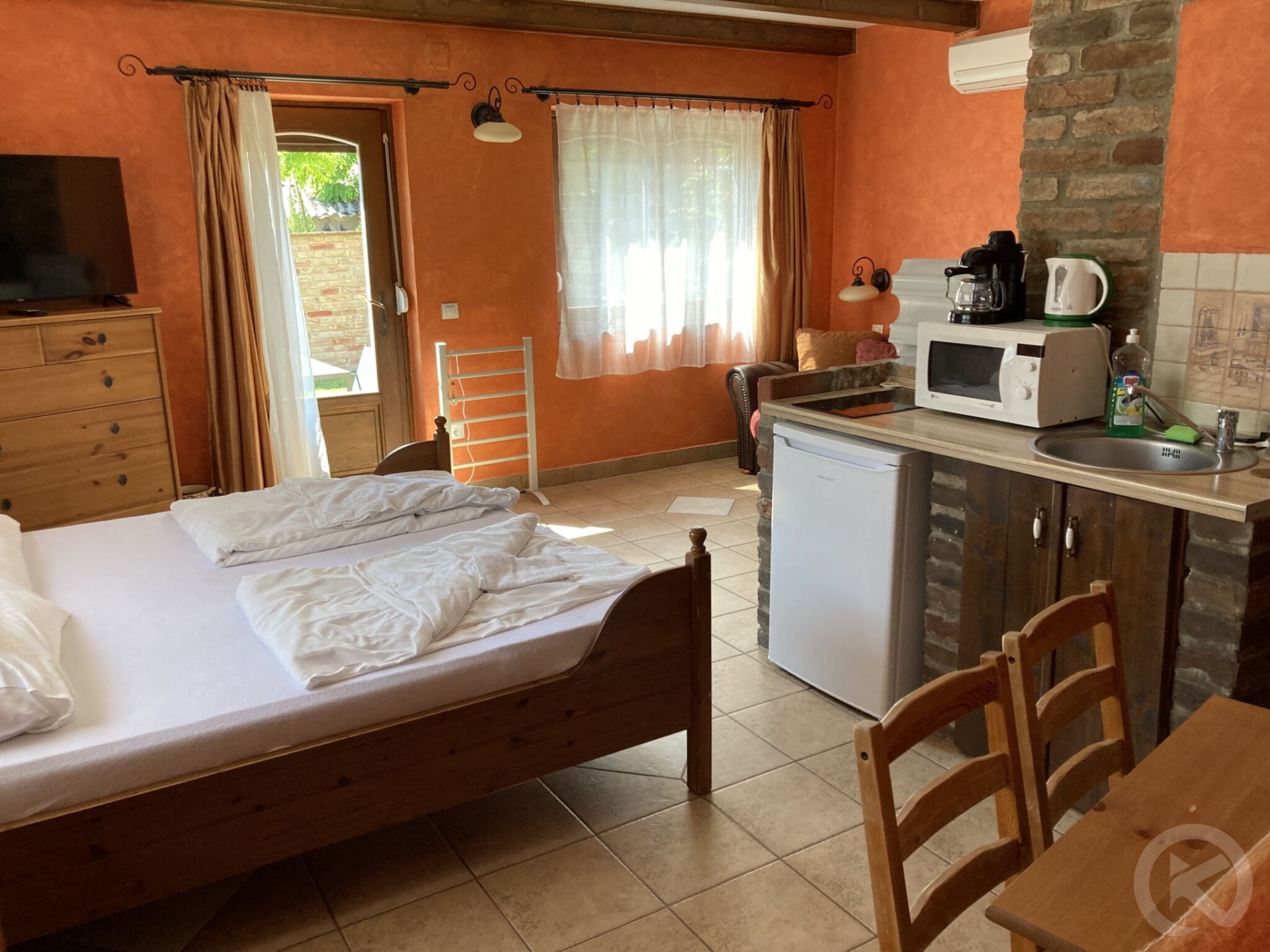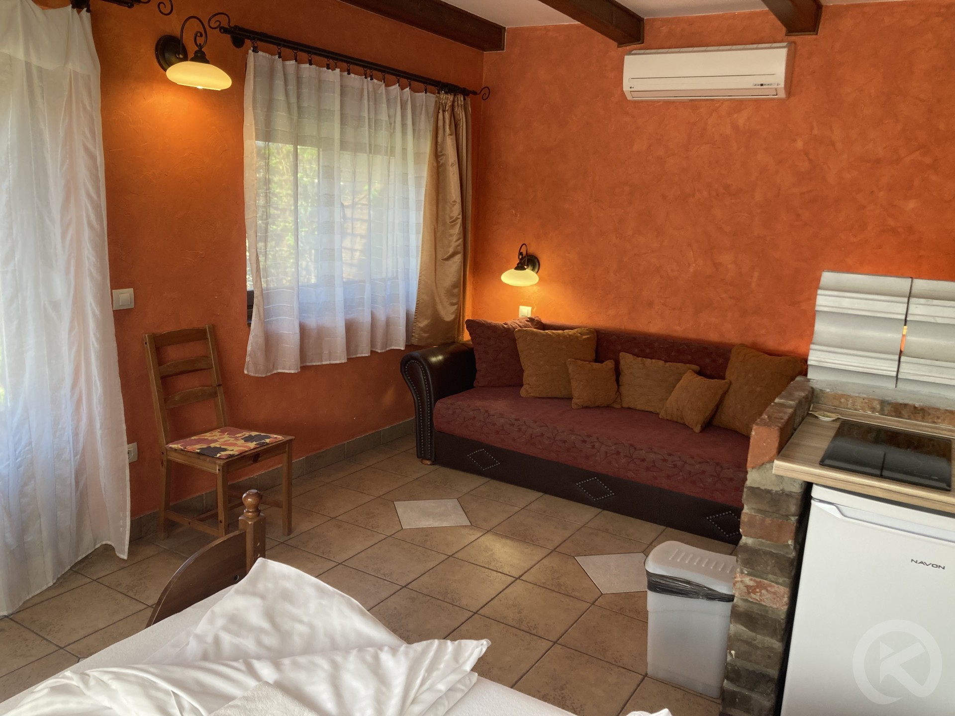 Camera de zi și dormitor: Televizor cu ecran plat, canapea extensibilă, lenjerie de pat, dulap, plasă de țânțari.