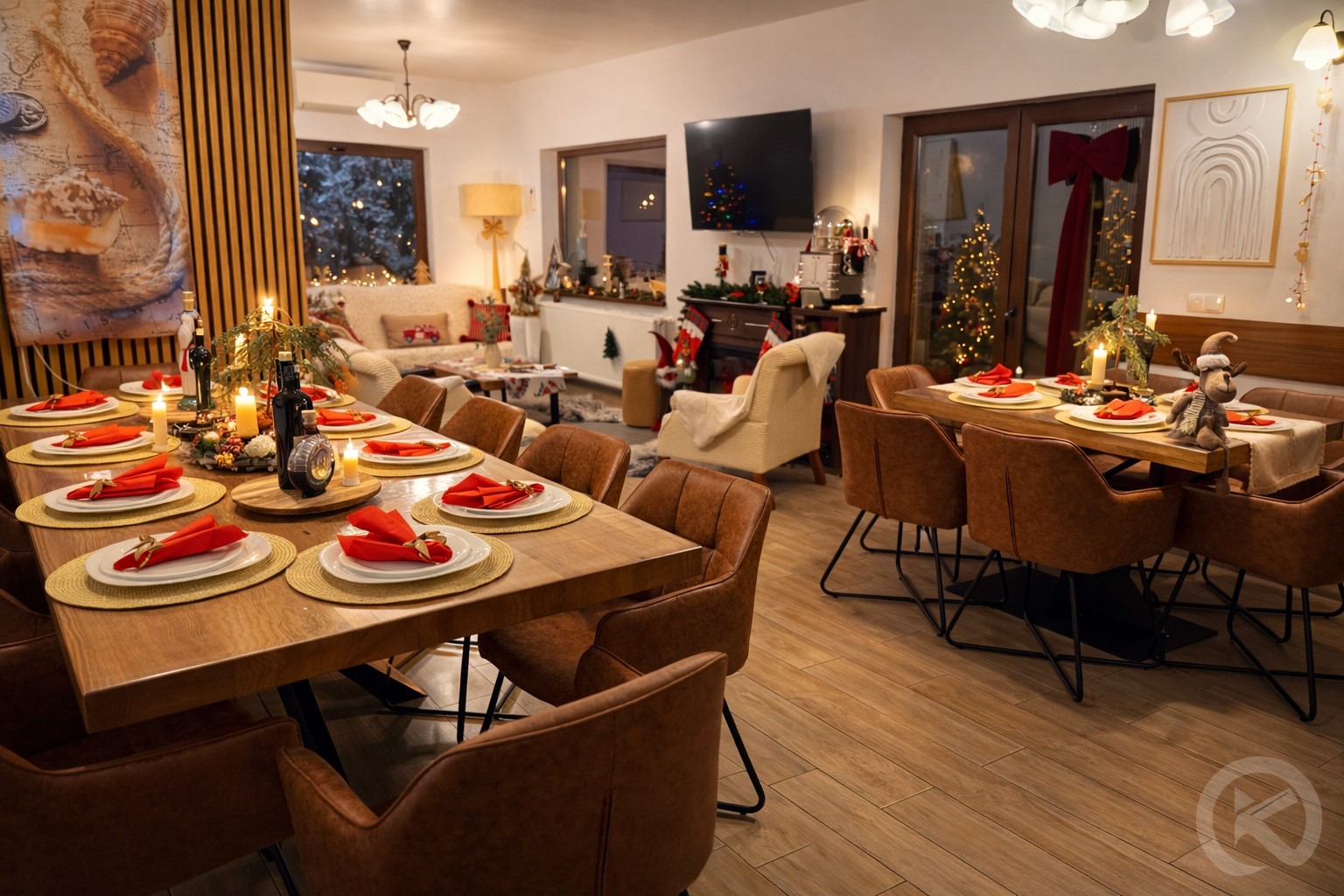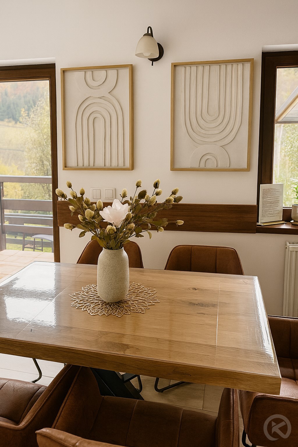 Zona de luat masa este spațioasă, fiind concepută special pentru a găzdui cine festive sau mic dejunuri prelungite în familie. Experiența culinară este completată în exterior de zona amenajată pentru grătar și ceaun, unde aroma preparatelor gătite la foc deschis se împletește perfect cu aerul curat de munte, oferind acea savoare autentică a vacanțelor la înălțime.