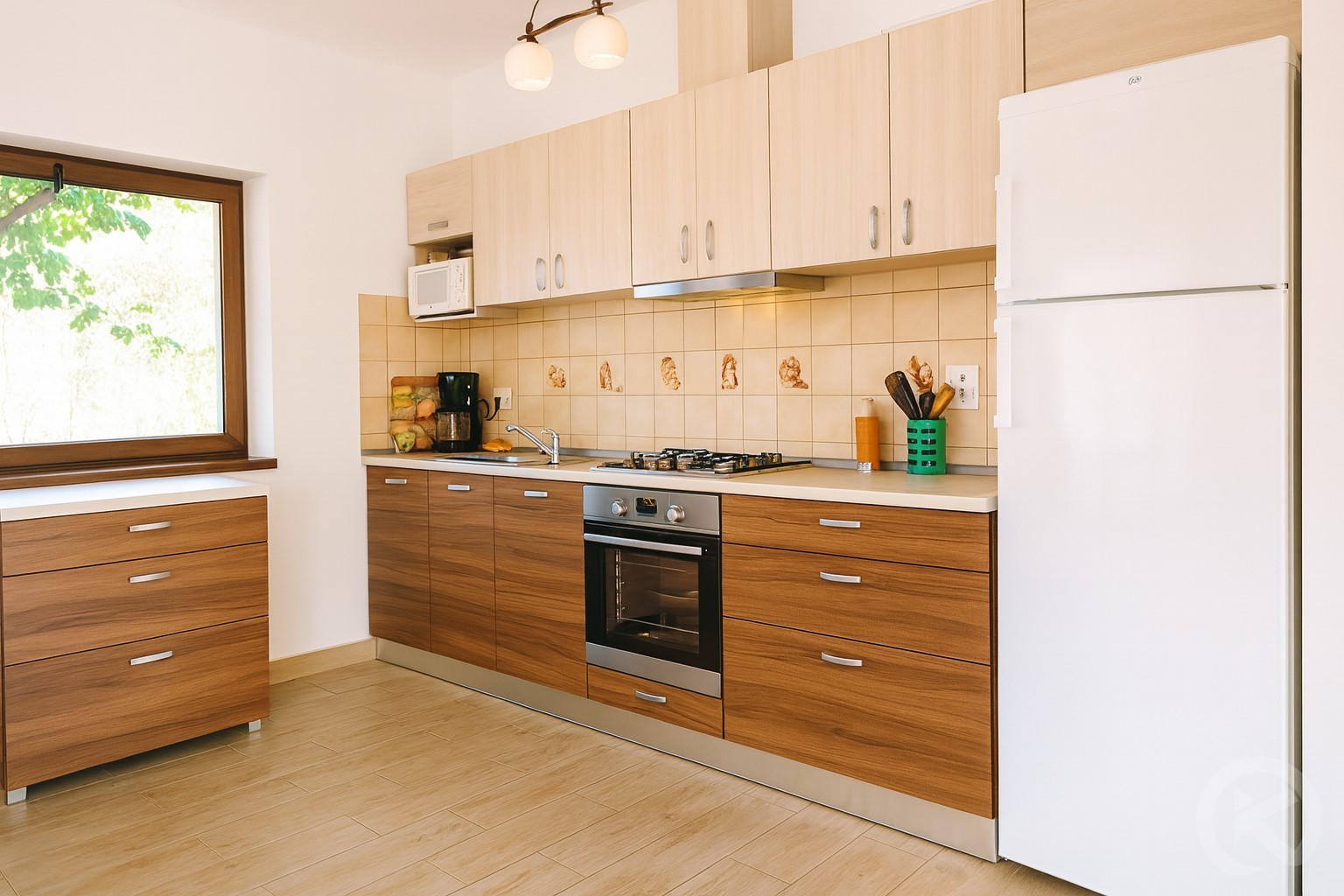 Bucătărie complet utilată și zonă de zi generoasă
